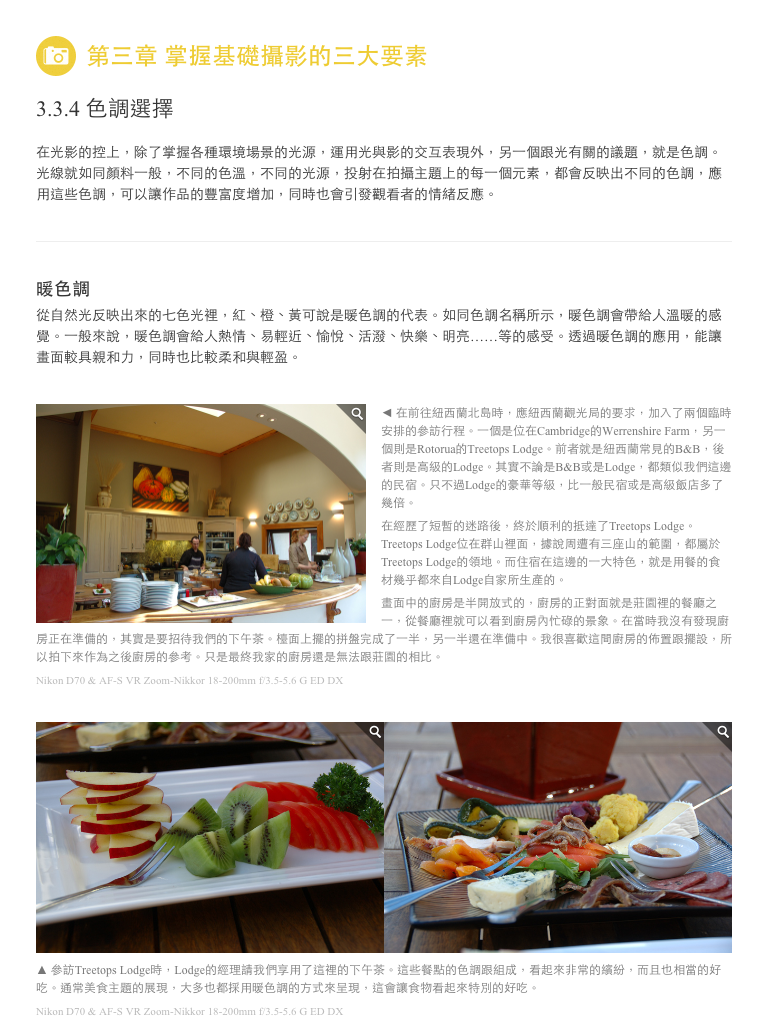 這本電子書的八個章節,彼此都有相互呼應,每一章所提到的攝影名詞、概念、拍攝方法,甚至是實例分享,目的都在於幫助讀者了解攝影的理論與概念,以及如何應用在不同的攝影場景上。隨著內容由淺入深,讀者慢慢的便能將這些敘述與說明,融會貫通成一個基礎的攝影概論,並提升自己攝影作品的掌握度。