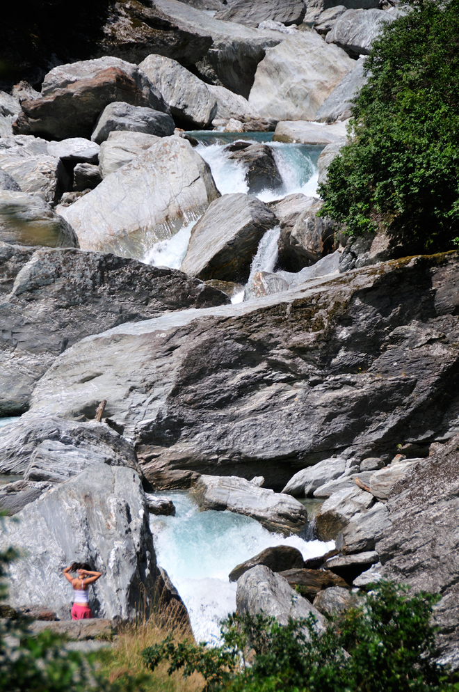 哈斯特河原本也是条冰河,但目前只能看到冰河的遗迹,而这里的河水湍急,加上冰河切割后的地貌,景色非常的壮观。我看到有人在河里外拍,看着那激流不断冲刷,对于来这里外拍的人像的决定,真的是相当的佩服。我注意到有一对情侣,往河道上方前进,感觉似乎想找个安全可以玩水的地方。
