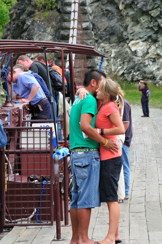 画面中的这对情侣,正准备一起「你跳我也跳」的活动,在要正式着装上场之前,他们在跳台前拥抱,相互给自己一些勇气,于是我就随手将这画面拍了下来。