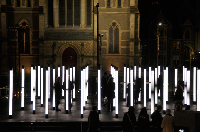 这个时段Federation Square有着The Light in Winter的展出活动,最吸引我注意的是广场上方的灯,以及靠近St Paul's Cathedral这一面的LED光柱区。白天经过时已经觉得很酷,夜晚时看着光柱区显示出动态的光影秀,看着游人在这区域里拍照、浏览,对比到后方的古典教堂,以及晚上灯光投射所营造出的光影,真的是非常的漂亮。我简单的构图后,拍下了这张照片。Nikon D300 & AF-S VR Zoom-Nikkor 18-200mm f/3.5-5.6 G ED DX