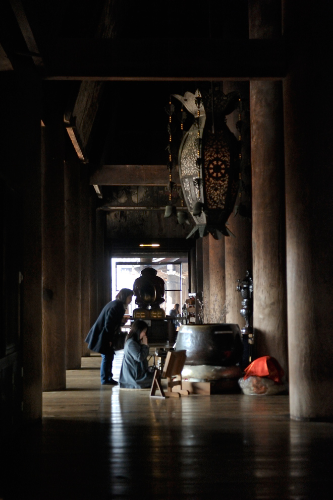 清水寺的主殿跟外面的广场有着很大的光线反差,进入主殿参拜的人不少,我想尝试拍摄主殿内祈愿的画面,因此我试着找出较佳的拍摄位置。为了不影响到他人,我发现主殿右侧的位置,可以看到大门跟祈愿的人们,于是我在这边稍微等待了一下,寻找适合的拍摄主题。