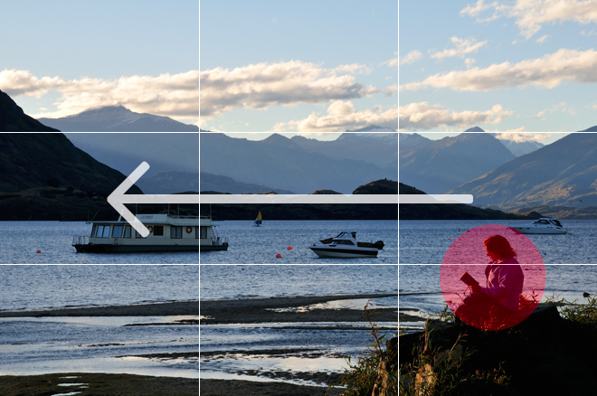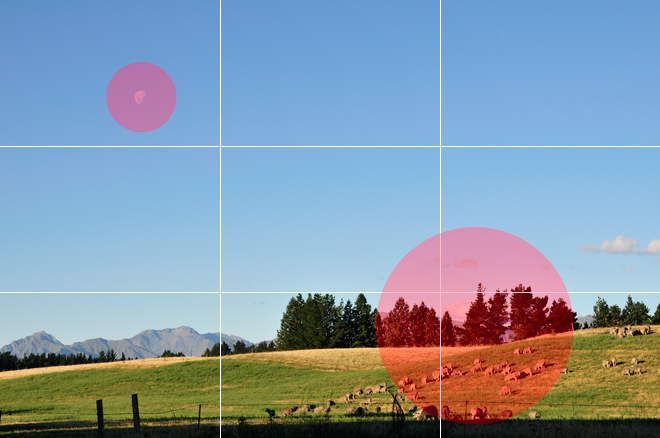 我在使用井字构图法时,初时会以四个点作为主体的摆放参考,但后来我较常使用的方式,是利用长与宽的三分之一区域,来进行构图的参考。透过区域的方式,可以让画面的组合更多元,而不会局限在四个点的位置上。