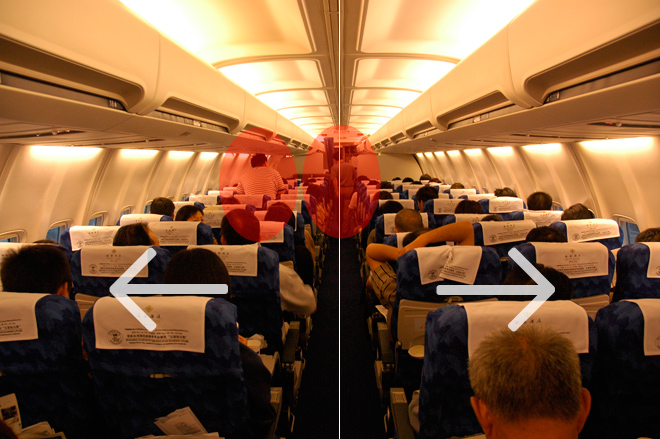 我选择正中间的位置,将画面的元素用四平八稳的对称式构图来表现。从正中央的位置来取景有些风险,多数的照片都会因此而显的有点无趣。而从我站立的方向往前看,刚好可以呈现放射状的延伸区块,配合着上方的机顶结构跟光影,与下方的座位乘客相互对比,加上前方两位走动与站立的旅客,刚好避开了百分百的对称,而这正是我想要获取的一瞬间。Nikon D70 & AF-S 18-70mm Nikkor f/3.5-4.5G ED